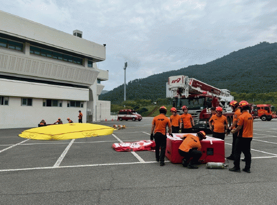 이날 훈련은 에어매트 외관 및 기능점검, 신속한 에어매트 전개 숙달, 에어매트 사용 시 주의사항, 안전사고 방지 교육 등이 주된 목적이다.