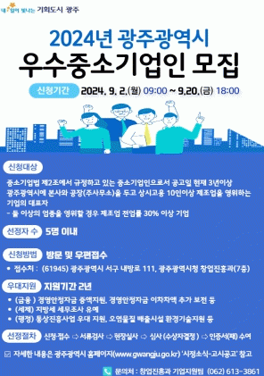 공모 대상은 공고일(27일) 기준 3년 이상 광주시에 본사와 공장(주사무소)을 두고 상시고용인원 10인 이상 제조업을 영위하는 중소기업의 대표자이다.