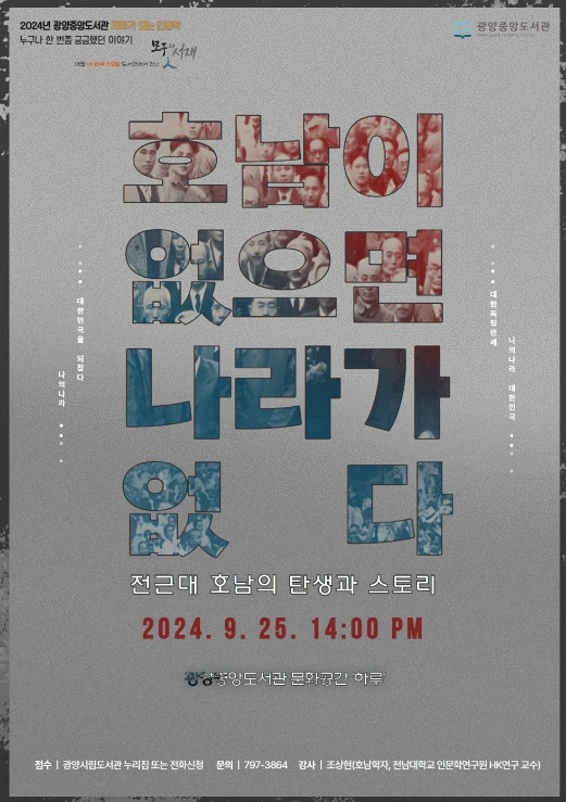 이번 행사는 2024년 중앙도서관 테마가 있는 인문학 ‘모두의 서재’ 7번째 강연이자 역사를 주제로 운영하는 첫 번째 강연으로, 전남대학교 인문학연구원 HK연구교수이자 호남학자인 조상현 교수를 초청해 진행한다.