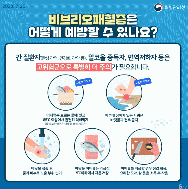 박양숙 보건행정과장은 “비브리오패혈증은 예방이 무엇보다 중요하다”라며 “어패류 충분히 익혀 먹기, 피부에 상처가 있는 사람은 오염된 바닷물과 접촉을 피하기, 바닷물에 접촉 시 깨끗한 물과 비누로 노출 부위 씻기, 사용한 도마나 칼은 소독하기, 손 씻기 등 감염병 예방수칙을 철저히 준수하시고 개인위생에도 주의를 기울이시기를 바란다”라고 당부했다.