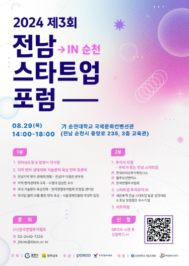 전남도, 광양시, 창업유관기관, 스타트업, 투자자 등 100여 명이 참석해 전문가 발표·토론과 스타트업 기업 투자유치 홍보활동(IR)·피칭이 진행될 예정이다.