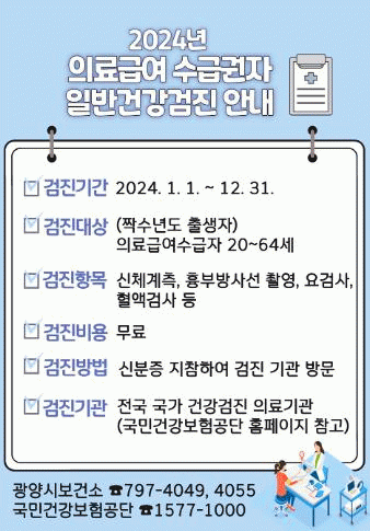 올해 의료급여수급권자 일반건강검진 대상자는 20세부터 64세(1960년생부터 2004년생) 중 짝수년도 출생자로 검진 항목은 △신체 계측 △시력, 청력 측정 △혈압측정 △흉부 방사선 △소변검사 △혈액검사 등이다.