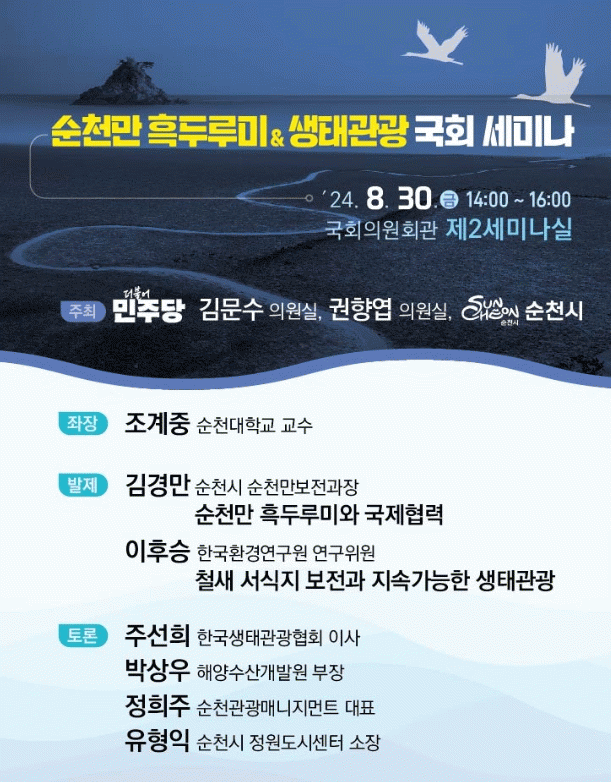 이번 세미나는 국제적인 멸종위기종 흑두루미 보호를 통한 순천만의 생태관광 성공사례를 소개하고 2023순천만국제정원박람회 이후 도심~국가정원~동천하구~순천만으로 이어지는 선단위 지속가능한 생태관광 정책을 발굴하기 위해 마련됐다.