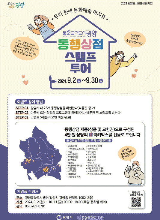 이벤트에 참여하는 동행상점 정보나 상품 수령 방법 등 기타 자세한 사항은 광양문화도시센터 누리집(홈페이지)와 SNS 채널에 안내돼 있으며 전화문의를 통해 안내받을 수도 있다.