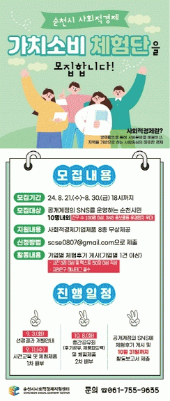 가치소비 체험단은 순천시민 10명 내외로 구성되며, 개인 블로그와 SNS를 운영하고 친구 수가 100명 이상인 시민을 대상으로 한다. 체험단은 사회적 가치소비의 개념에 대한 사전 교육을 받고 활동을 시작하게 된다.