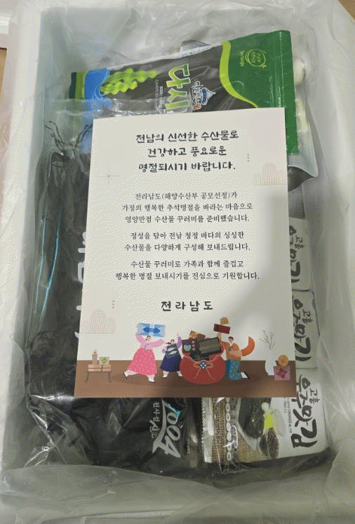 박영채 전남도 해양수산국장은 “이번 수산물 꾸러미 지원을 통해 대상 가정에는 나눔의 추석명절이 되고, 어가에는 소비촉진을 통한 활력의 계기가 되길 바란다”며 “명절에 가족과 함께하는 음식으로 전남의 신선 수산물이 애용되도록 다양한 판촉에도 힘쓰겠다”고 밝혔다.