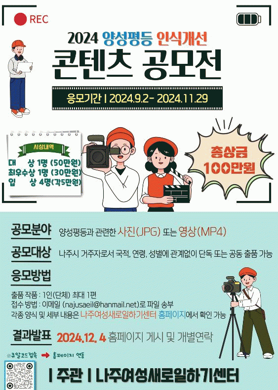 상장과 상금은 양성평등 인식 개선에 기여한 작품에 수여되며 결과는 오는 12월 4일 나주여성새로일하기센터 홈페이지 및 개별 연락을 통해 발표된다.