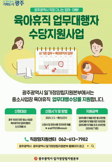 광주광역시는 최근(8월27일) 국무회의에서 정부의 일·가정 양립지원 대책으로 광주시가 첫 시행한 ‘육아휴직 업무대행수당’을 반영했다고 밝혔다.