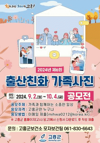 이번 공모전은‘가족과 함께하는 소중한 일상’을 주제로 고흥군민이라면 누구나 참여할 수 있으며, 접수 기간은 9월 2일부터 10월 4일까지이다.