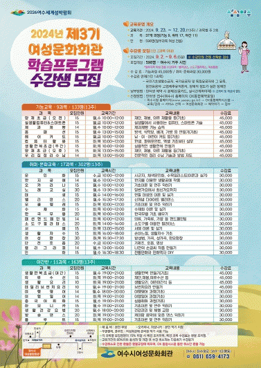 신청 방법은 여수시 OK통합예약시스템 접속▶ 교육강좌 ‘여성문화회관’ 선택▶ 예약하기 클릭 후 원하는 프로그램을 신청하면 된다.