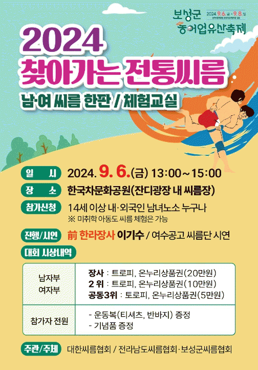 경기는 6일 오후 1시부터 3시까지 초록 차밭과 잔디광장이 어우러진 국가농업유산 축제장에 특설 씨름판을 설치해 관광객과 외국인, 일반인을 대상으로 현장에서 참여 신청을 받아 성인 남자부와 여자부 각 토너먼트 방식으로 진행된다.