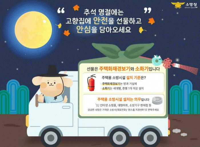 최진석 서장은 “주택용 소방시설은 온라인이나 마트 등에서 쉽게 구입할 수 있다.”라고 하며 “안전하고 즐거운 추석 명절을 위해 주택용 소방시설 선물하기에 동참해달라”라고 말했다.