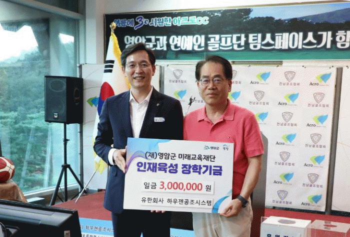 신 대표는 “오늘 영암에서 열린 연예인 자선골프대회에 의미를 더하기 위해서 장학금을 기부하기로 했다. 지역 미래인재의 재능을 길러주는 곳에 잘 쓰이길 바란다”고 전했다.