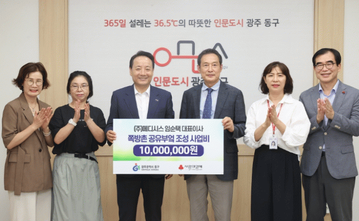 이날 성금 전달식는 임택 구청장, 임순택 ㈜메디시스 대표, 박흥철 광주사회복지공동모금회 사무처장 등이 참석했다. 임 대표가 이날 기부한 1천만 원은 관내 쪽방촌 공유부엌 조성 사업비로 사용될 예정이다.