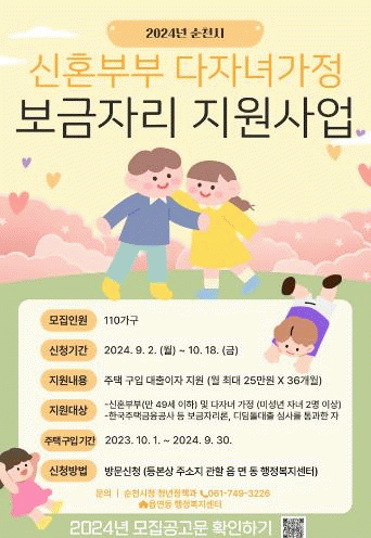 신청 대상은 한국주택금융공사, 주택도시보증공사 등의 보금자리론, 디딤돌 대출 심사를 통과해 2023년 10월부터 2024년 9월까지 순천시 소재 6억 이하 주택을 구입한 순천시 거주 신혼부부와 다자녀가정이다.