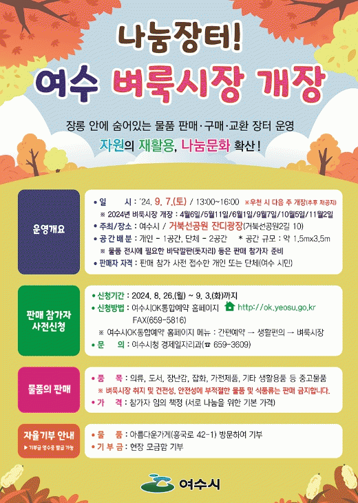 여수시민이라면 누구나 벼룩시장을 통해 중고 의류, 도서, 장난감, 잡화, 가전제품 등을 자유롭게 판매·구매하거나 교환할 수 있으며, 행사 후 물품·수익금을 자율적으로 기부할 수 있다.