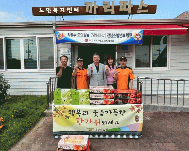 오승훈 전남소방본부장도 나주시 관내 노인복지센터 까리따스를 방문하여 “소소한 정성이지만 이웃과 함께 따뜻한 정을 나누는 명절을 보내는 데에 조금이나마 도움이 되길 바란다”며, “도민 모두가 안전한 추석 명절을 보낼 수 있도록 어려운 이웃에 지속적인 관심을 갖도록 노력하겠다”고 전했다.