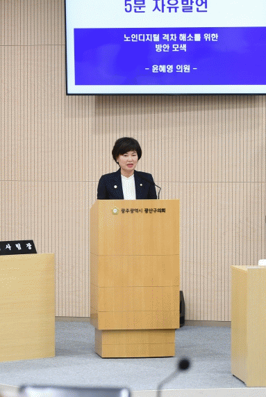 이에 “광산구는 2023년부터 중·노년층을 대상으로 한 ‘신중년 디지털 평생교육’을 시행하고 있지만, 디지털 전환 속도와 4만 5천여 명이라는 노년층 인구수를 충족하기엔 부족한 실정”이라며 “기존 노인복지관을 ‘스마트노인복지관’으로 전환·활용한다면 노인 디지털 격차 해소의 대안이 될 것”이라고 피력했다.