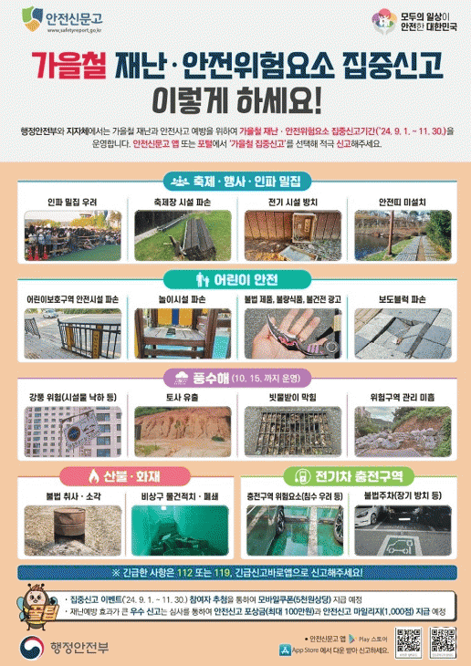 이번 집중 신고 기간은 가을철에 자주 발생하는 재난ㆍ안전사고를 예방하기 위해 운영한다.