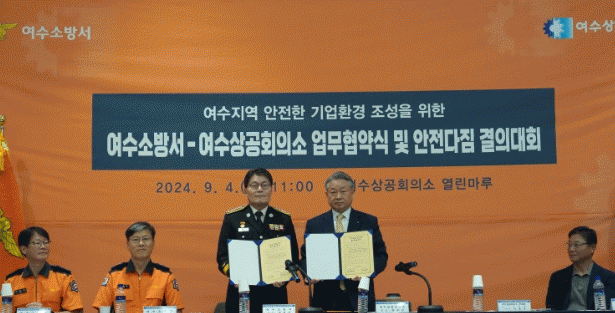 이날 여수소방서와 여수상공회의소는 지역사회에 대한 안전의식 제고와 소방안전분야의 효율적인 상호 협력체계를 구축하기 위한 업무협약을 체결했다.