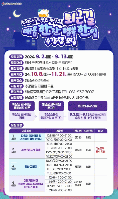 군 관계자는“직장인들이 일과 삶의 균형을 추구하고 자기계발을 하는데 있어서 시간적 경제적 부담을 줄일 수 있도록 퇴근 후 강좌를 마련했다”며“평소 평생학습에 참여하기 어려웠던 많은 군민들의 관심 부탁드린다”고 말했다.