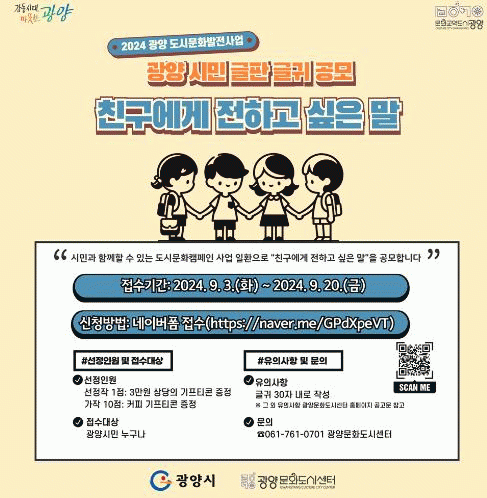 박시훈 광양문화도시센터장은 “시민 글판 글귀 공모는 ‘공감’이 중심되는 문화사업으로, AI도 흉내 내기 어려운 공감이야말로 지극히 인간적이고 문화적인 능력이다”라며 “친구에게 전하는 말 한마디로 보는 이의 미소가 절로 지어지기를 기대한다”라고 말했다.