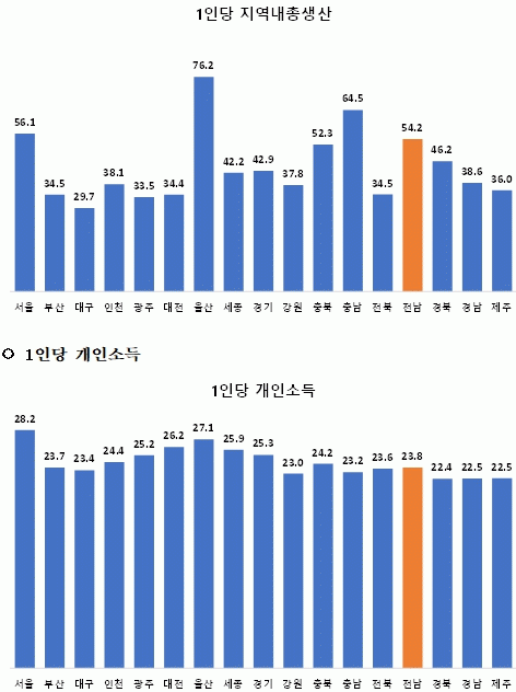 이에 따른 전남의 1인당 총생산은 5천418만 원으로, 전국 평균(4천505만 원)을 크게 웃돌면서 울산과 충남, 서울에 이어 전국 4위를 기록했다.