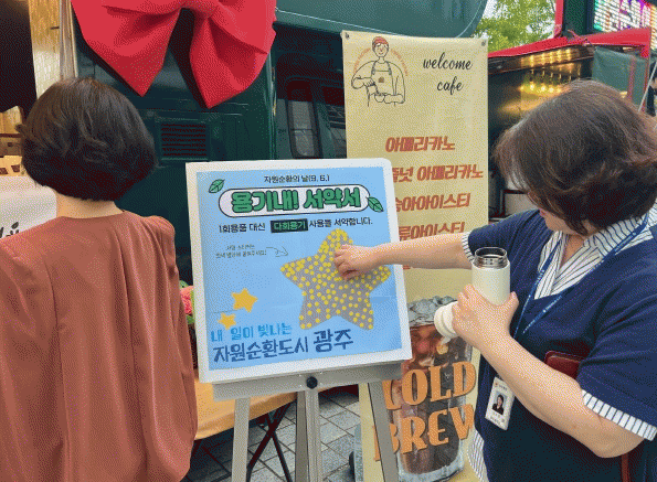 광주시는 공공기관 일회용품 줄이기를 위해 ‘일회용 컵 없는 커피차 행사’를 열고 개인컵을 가져온 참여자에게 커피를 제공, 일상 속에서 일회용품 줄이기 실천을 다짐했다.