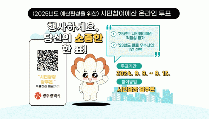 투표 참여자는 2025년도 예산편성 적정성 평가(상·중상·중·중하·하)와 2023년도 추진 완료한 시민참여예산 사업 17건 중 2건을 우수사업으로 선정하면 된다. 광주시민이라면 누구나 투표에 참여할 수 있다.