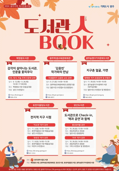 광주광역시립도서관은 올해 하반기 시민 독서진흥사업으로 오는 12일부터 11월30일까지 책정원도서관, 광주학생교육문화회관, 양산도서관, 효천어울림도서관, 광주송정다가치문화도서관에서 ‘도서관·人·book’ 행사를 연다.