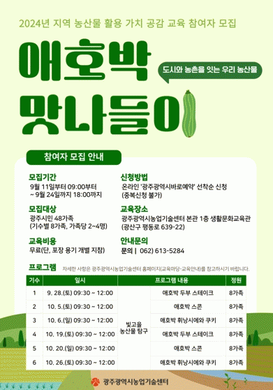 자세한 내용은 광주시농업기술센터 누리집(교육마당→교육안내)이나 융복합지원팀으로 문의하면 된다.