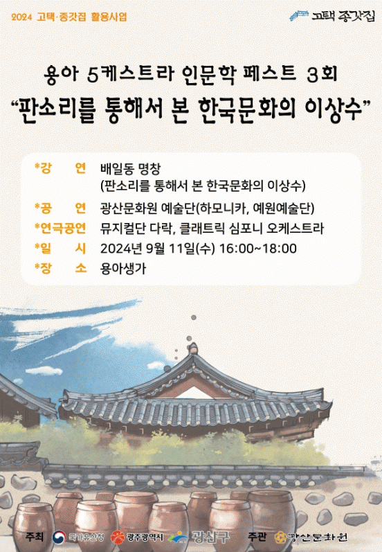 ‘용아 오케스트라 인문학 페스트’는 국가유산청, 광주광역시, 광산구가 주최하고 광산문화원이 주관하는 고택?종갓집 활용 사업의 하나다. 용아 박용철의 문학 작품을 재해석한 오케스트라 공연, 명사 초청 인문 강연을 선보인다.