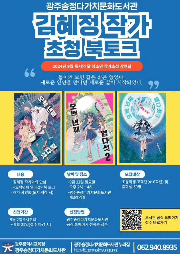 김혜정 작가는 교보문고 청소년 베스트셀러 ‘오백 년째 열다섯’, 밀리의 서재 종합 베스트셀러 1위 ‘분실물이 돌아왔습니다’ 등의 저자로 이번 강연에서 청소년들이 사춘기 시기에 겪게 되는 고민에 대해 소통하며 용기를 심어줄 예정이다.