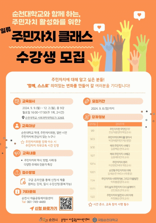일류 주민자치 클래스 참여 신청 및 자세한 사항은 순천시 마을공동체지원센터 누리집 또는 전화 로 문의하면 된다.