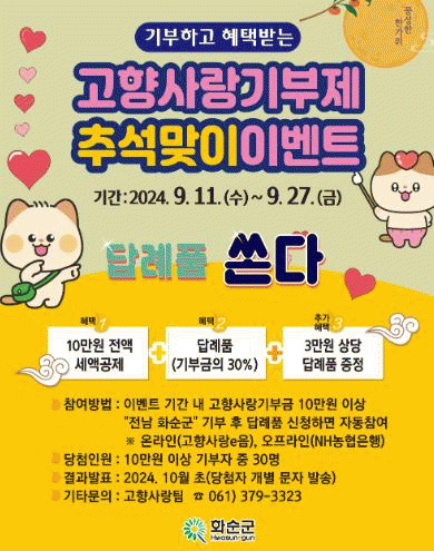 구복규 화순군수는 “이번 이벤트는 추석 명절을 맞아 화순군을 사랑하는 따뜻한 마음을 함께 나누기 위해 마련했다.”라고 전했다.