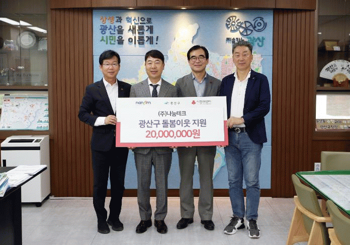 ㈜나눔테크는 지역 140여 개 기업의 자발적 참여를 통해 복지공동체 구현에 앞장서고 있는 (사)선한기업100+ 원탁회의 참여기업으로, 광산구 사회적 고립가구 해소를 위한 ‘1313 이웃살핌’ 사업을 정기후원하고 있다.