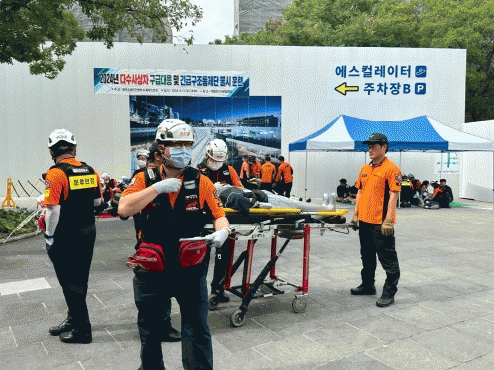훈련은 국립아시아문화전당 지하주차장에서 전기차 화재가 발생한 상황을 가정해 화재 발생, 주차장 내 교통사고, 대피 중 통로 밀집사고 등에 따른 ▲화상·질식 환자 ▲출혈·골절 등 외상 환자 ▲깔림에 의한 압착 부상자 등 50명의 다수 사상자가 발생한 상황에 대응한 훈련으로 진행됐다.