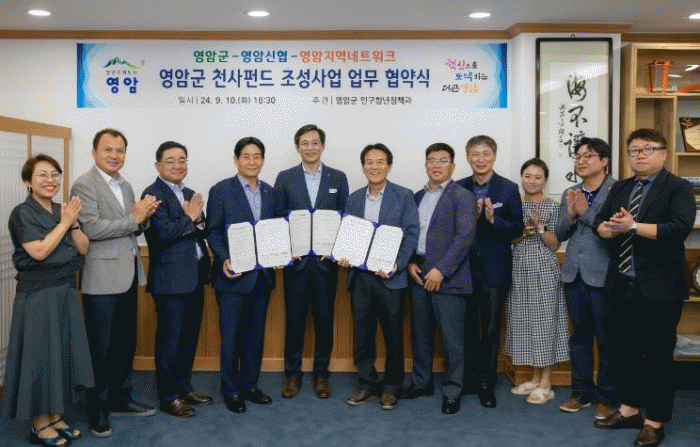 영암군이 10일 군청에서 영암신용협동조합, 사회적협동조합 영암지역네트워크와 ‘영암군 천사펀드 조성사업 업무협약’을 체결했다.
