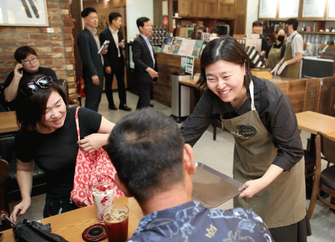 이어 오후 2시에는 장애인 청년의 자립을 돕는 ‘카페홀더’ 광산구청점에서 임은정 대전지방검찰청 부장검사의 일일 명예 점장 행사가 진행됐다. 광주인화학교 사건 당시 광주지방검찰청 공판 검사로 인연을 맺은 임 검사는 지난해 카페홀더 10주년 때도 명예 점장을 한 바 있다.
