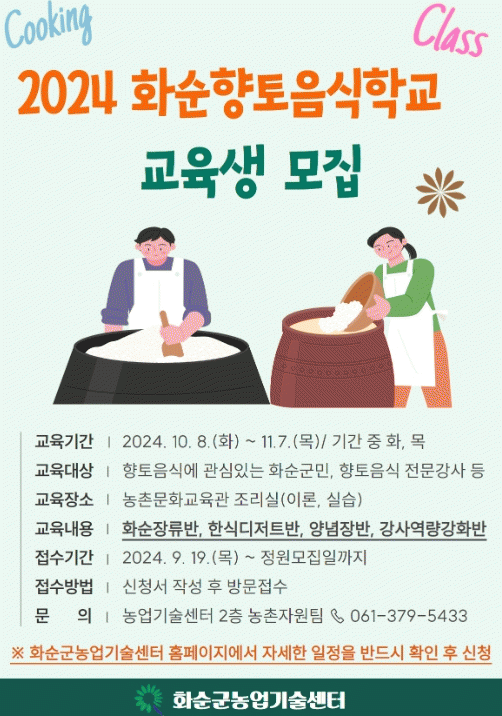 모집과정은 2개 분야로 화순 전통장류와 한식디저트 등을 배울 수 있는 향토음식과정과 음식 콘텐츠 제작 및 화순향토음식 개발을 위한 향토음식 전문가 역량강화 과정으로 추진할 계획이다.