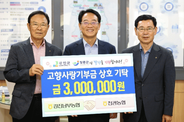 최길선 강진남부농협 조합장은 “상호기부에 동참해주신 장흥군지부, 천관농협 임직원분들께 감사드린다”.며 “한가위를 맞아 진행한 이번 교차기부로 지역 간 협력과 고향사랑기부제 기부문화 확산에 보탬이 되길 바란다”고 말했다.