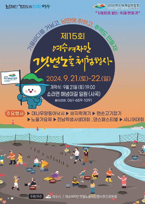 13일 여수시에 따르면 올해 행사는 무사 안녕과 풍어를 비는 ‘당산제·풍어제’를 시작으로 이곳에서만 즐길 수 있는 ‘대나무 망둥어 낚시’, ‘맨손고기잡이 체험’, ‘바지락 캐기 체험’, ‘가족 명랑운동회’ 등 다채로운 체험행사가 진행된다.