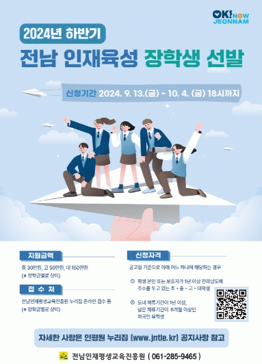 신청은 10월 4일까지 전남인재평생교육진흥원 누리집이나 추천기관을 통해 하면 된다. 자세한 사항은 인평원 누리집 공지사항에서 확인할 수 있다.
