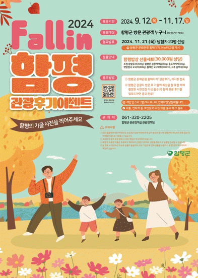 참여 방법은 함평군의 주요 관광지를 방문해 가을의 매력을 담은 사진을 찍고, 함평군 문화관광 홈페이지에 함평 가을에 대한 소감과 함께 관광 후기를 작성하면 된다. 참여자 중 20명을 선정해 함평 농특산품 선물세트를 경품으로 증정하며, 당첨자는 11월 21일 함평군 공식 인스타그램과 홈페이지에서 발표된다.