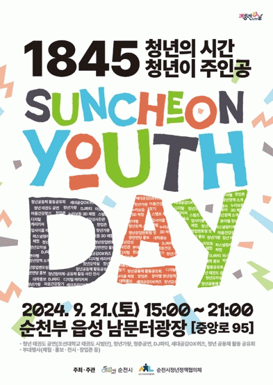 오는 21일 오후 3시부터 9시까지 순천부 읍성에서 열리는 ‘2024 순천 청년의 날’ 행사는 ‘1845 청년의 시간, 청년이 주인공’을 주제로 유공자 표창 및 청년 세대별 비전선포, 세대공감 OX퀴즈, 청년태권도 공연, 청년가왕, DJ파티 등 청년들이 즐기고 참여하는 프로그램으로 운영되며, 수상무대에서는 힐링라이브 청춘공연이 펼쳐진다.