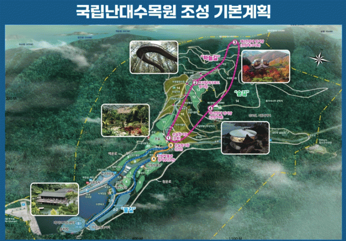 이에 따라 확정된 기본계획은 난대숲의 지속가능한 가치 창출을 선도하는 세계적 수목원 조성을 목표로 5대 랜드마크인 ‘하늘길 모노레일, 레이크가든, 다도해 전망대, 전시온실, 트리탑데크로드’를 조성한다는 내용을 담았다.