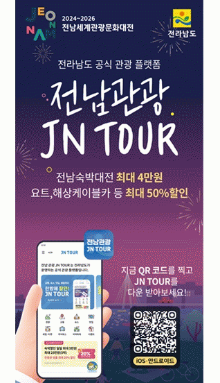 전남 여행을 가성비 있게 즐기도록 결제금액에 따라 숙박할인 쿠폰을 제공하는 ‘남도 숙박할인 빅 이벤트’도 추진한다. 지원 대상은 전남 외 주소지를 둔 관광객으로, 도내 숙박업소 이용 시 결제금액 10만 원 이상은 4만 원, 7만 원 이상은 3만 원, 7만 원 미만은 2만 원 할인 쿠폰을 제공한다. ‘전남 사랑애(愛) 서포터즈’ 인증 시 1만 원 추가 할인을 제공한다. 숙박업소 예약·결제는 전남관광플랫폼(JN TOUR) 앱에서 가능하다.