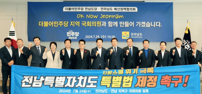 전남도는 지난 7월 지역 국회의원 10명과 함께 ‘전남특별자치도 특별법 제정 촉구 성명서’를 발표하고, 여야를 가리지 않고 특별법의 신속한 통과를 위한 건의 활동을 펼치고 있다.
