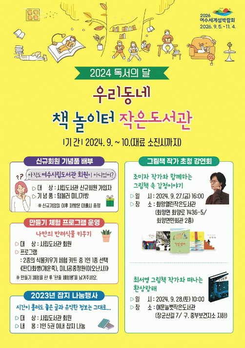 시 관계자는 “여수시 전역 15개 공공도서관에서 독서의 달을 맞아 다채로운 독서문화행사를 준비했다”며 “올가을 근처 도서관을 찾아 독서와 문화로 가득 찬 낭만 있는 시간을 보내시기 바란다”고 말했다.