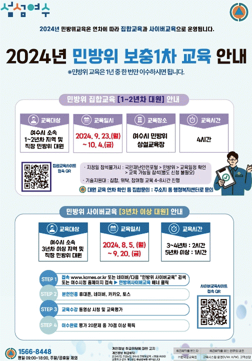지자체별 교육 일정은 국민재난안전포털에서 확인하거나 여수시청 안전총괄과, 거주지 주민센터로 문의하면 안내받을 수 있다.